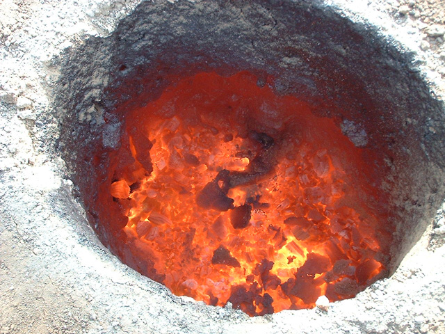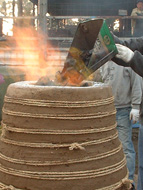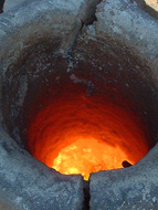 赤土でつくった炉に、原料の砂鉄と還元のための木炭を入れて、風を送り、鉄を取り出す古来の鉄を作ります。1回の作業は、3昼夜、約70時間にもおよび、炉の壁が侵食されて薄くなり、耐えられなくなったところで終了します。